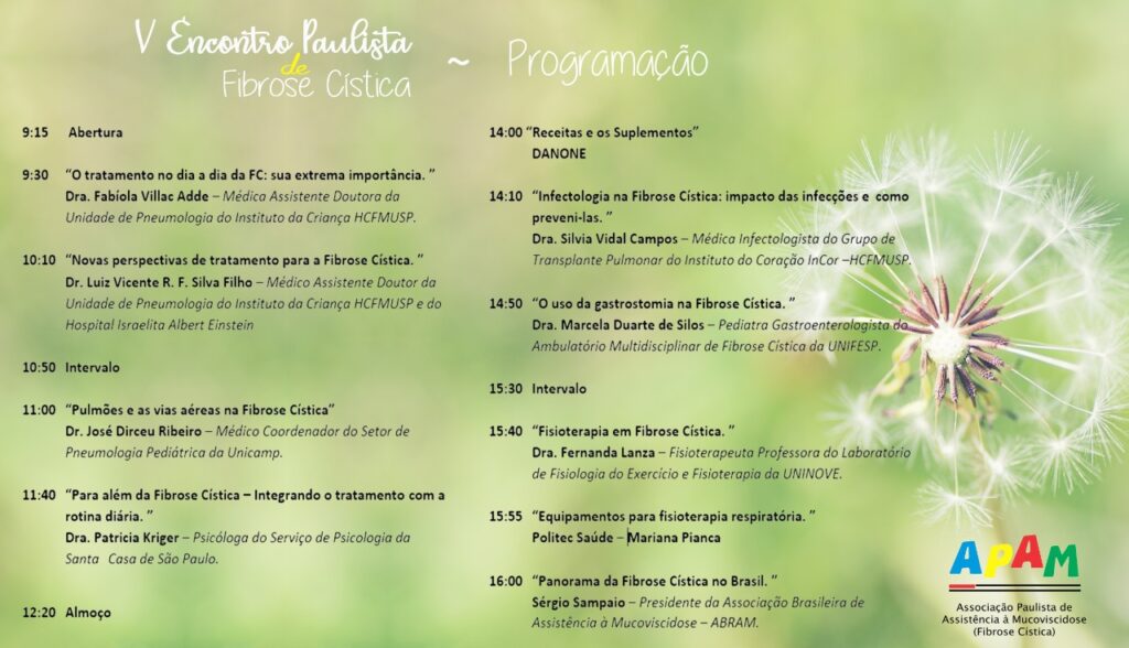 A APAM tem o prazer de convidá-lo para o V Encontro Paulista de Fibrose Cística, que será realizado na Câmara Municipal de São Paulo, no dia 15 de setembro de 2018, das 9:00h às 17:00h. Segue em anexo a programação completa. Confirme sua presença enviando uma mensagem para o WhatsApp da APAM (11) 94485-0264, com seu nome completo, e quantas pessoas irão com você!! Atenciosamente, APAM